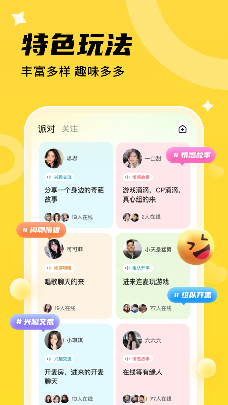 心遇cp核心功能围绕语音社交展开。其语音派对支持多人实时连麦,覆盖CP匹配、游戏开黑、K歌、相亲等主题场景,用户可通过声音互动快速破冰。遇见CP模块提供双向匹配机制,用户可互赠虚拟礼物、共同打造专属CP空间并记录互动轨迹,增强情感纽带。动态广场支持图文及音视频内容分享,便于展示生活瞬间并发现同好。平台集成实名认证与活体检测系统,确保用户信息真实可信。