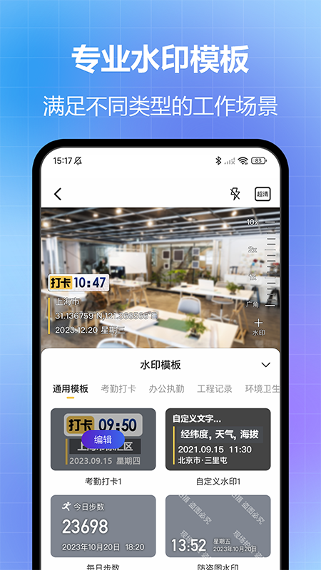 其特色集中体现在专业化的场景模板与丰富的设计资源上:一是内置大量针对不同场景优化的专业水印模板库,如考勤打卡(强调真实时间地点)、工程管理、执勤记录、品牌宣传、会议记录等,覆盖主流工作场景;二是提供风格多样的视觉元素库,包含海量水印样式、滤镜效果及装饰性贴纸,满足用户对图片美化与隐私信息遮挡的需求;三是模板设计兼顾实用与美观,用户可根据具体需求(如项目巡检、外勤拍照、现场取证)快速选用最适配的模板。