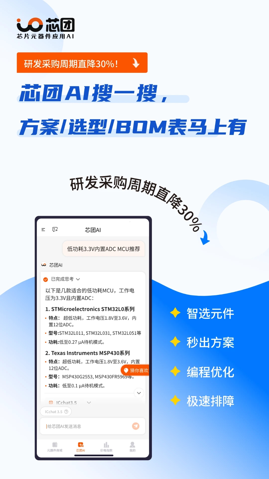 芯团是一款专注于电子元器件领域的综合性服务平台,该平台深度融合人工智能技术与电子工程专业知识,为芯片选型、物料清单生成、市场交易等环节提供全面解决方案,通过实时数据分析与智能算法匹配,显著提升元器件采购与研发效率。